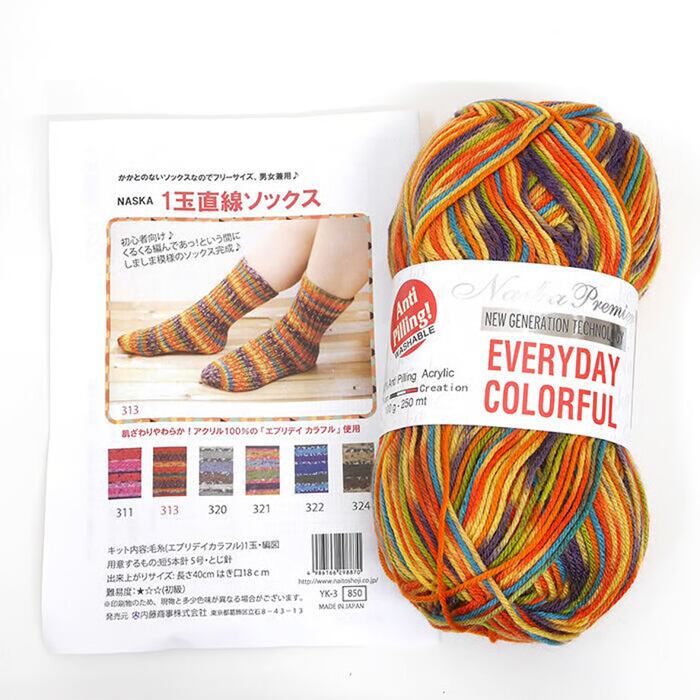オールシーズン糸のアクリル糸「エブリデイカラフル」1玉で編めちゃうカラフルな模様がかわいいソックスが作れるキットです。