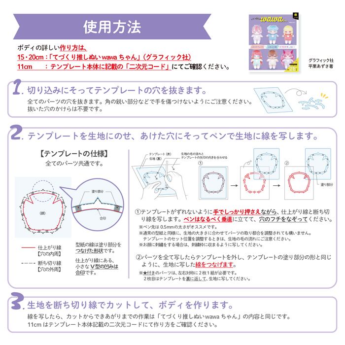 ※詳しい作り方は11cmはテンプレート本体に掲載の二次元コード、15cm・19cmは書籍「てづくり推しぬいwawaちゃん」(グラフィック社)を参考にしてください。