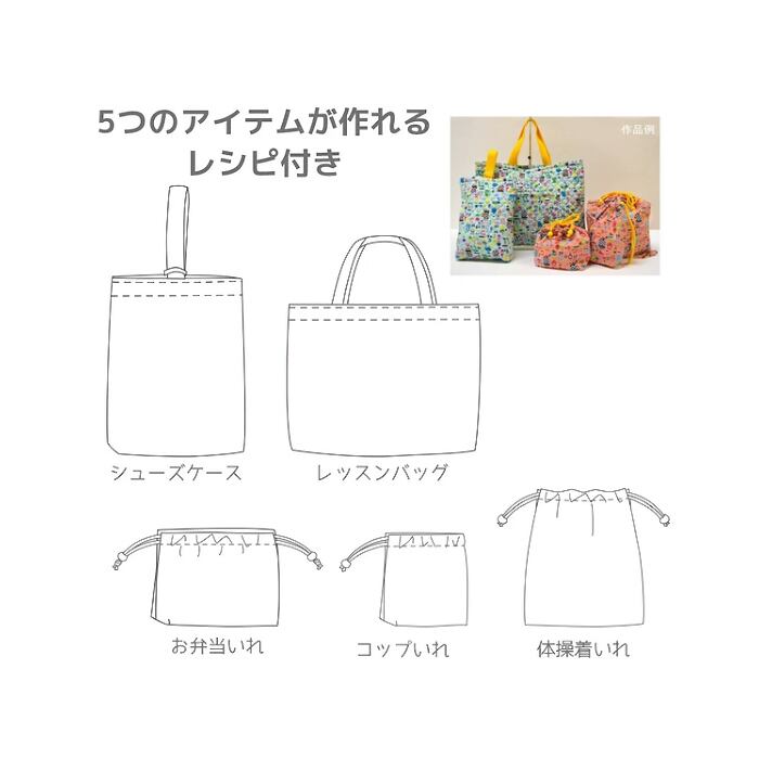 お子様の通園通学に使えるシューズケース、レッスンバッグ、お弁当入れ、コップ入れ、体操着入れの5アイテムの小物がすべて作れるレシピが付いた便利な材料セットです。